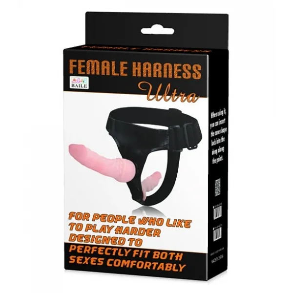 El Arnés Femenino Ultra presenta un diseño cómodo de usar por sus correas con adaptadores. El Arnés es de color negro fabricado de material elasticado, sus correas son gruesas y van sobre las caderas lo cual permite un uso con mayor seguridad sin riesgo a que este ceda. Los consoladores de diseño realista que van incluidos al arnés, son macizos, flexibles y de dos dimensiones para una doble penetración.